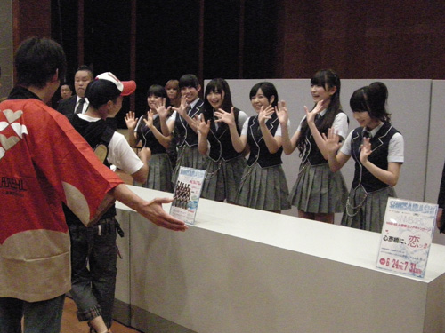デビューCDの予約販売会に来たファンに手を振るNMB48(左から)山口夕輝、篠原栞那、岸野里香、近藤里奈、吉田朱里、小笠原茉由