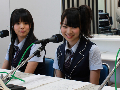 心斎橋筋商店街の「街内放送」に出演したNMBの(左から)山口夕輝、小笠原茉由